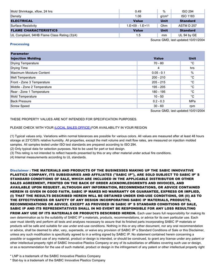 应用范围: 产品描述 LNP Statloy A3000物性表 “LNP STAT-LOY A3000是一种丙烯腈丁二烯苯乙烯(ABS)材料,加工方式为:注射成型。 LNP STAT-LOY A3000的主要特性为:抗静电。” 相关颜色色号:A3000-YW8A121、A3000-BK8115、A3000-GY1G138、A3000-GYLTNAT LNP STAT-LOY* A3000 is
