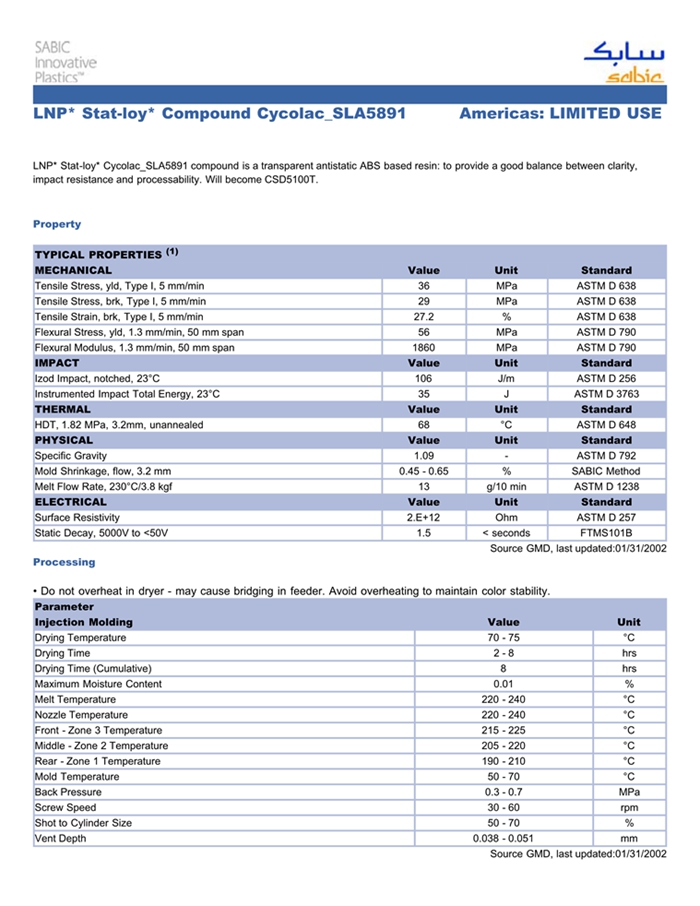 LNP* Stat-loy* Cycolac_SLA5891 compound is a transparent antistatic ABS based resin: to provide a good balance between clarity, IMPACT resistance and processability. Will become CSD5100T.