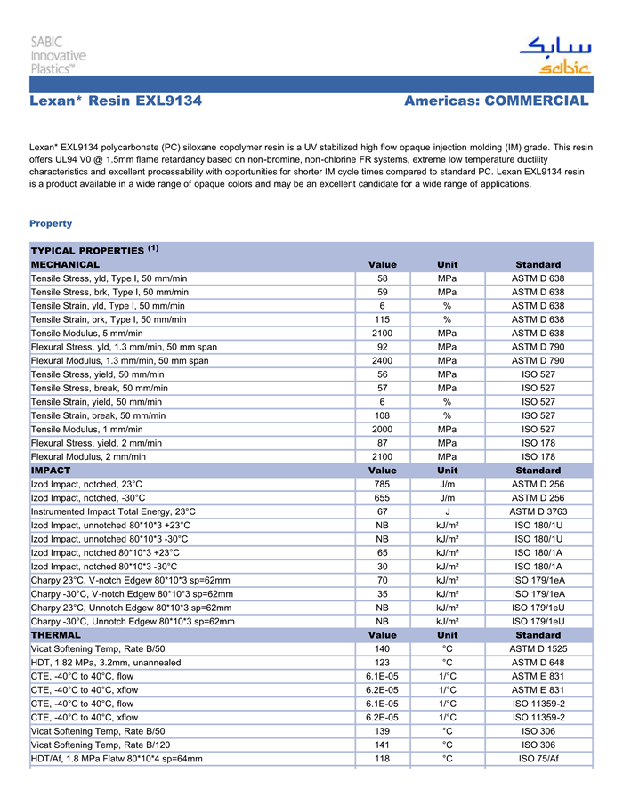 应用范围:产品描述Lexan PC EXL9134物性表“Lexan EXL9134 resin是一种聚碳酸酯(PC)产品,它可以通过注射成型进行加工, 典型应用领域为:户外应用。特性包括:阻燃/额定火焰Flame Retardant无卤素高流动性共聚物”。相关颜色色号:EXL9134-BK1A068、EXL9134-4T8D002、EXL9134-7A8D006、EXL9134-WH9D665、EXL91