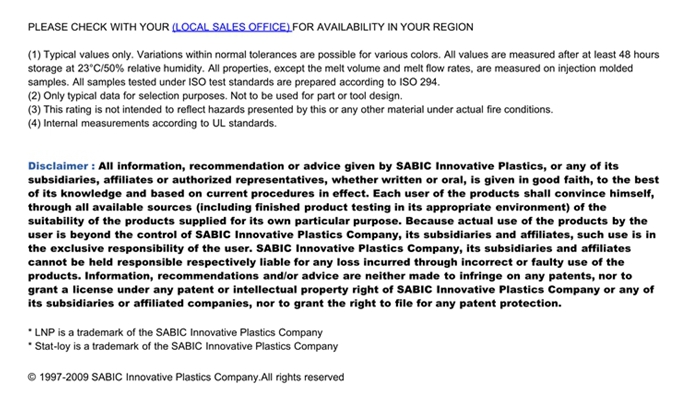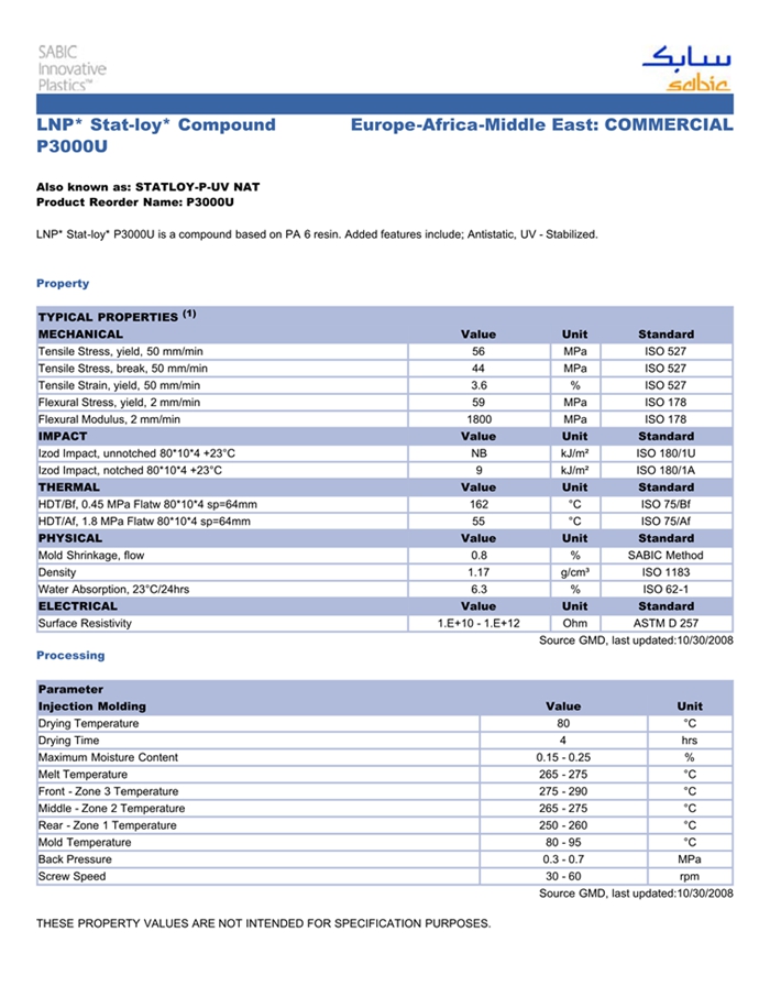 应用范围:产品描述LNP STATLOY P3000U物性表LNP STAT-LOY P3000U是一种聚酰胺6(尼龙6)材料,加工方式为:注射成型。LNP STAT-LOY P3000U的主要特性有:通过ROHS认证抗静电紫外线稳定