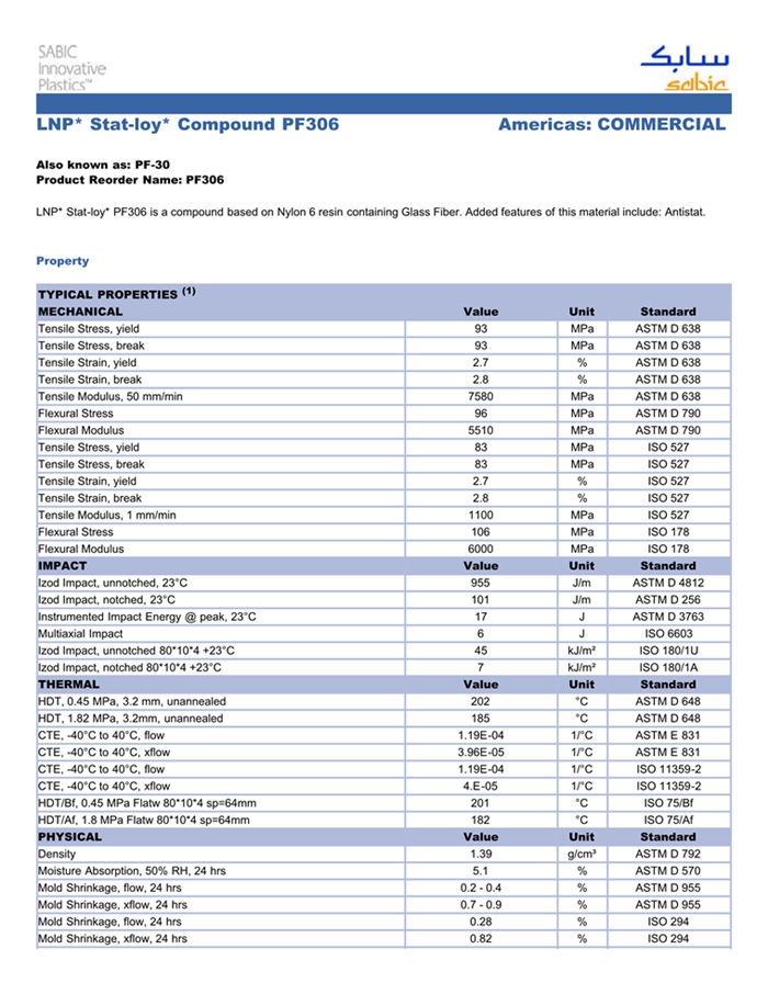 应用范围:产品描述LNP STATLOY PF306物性表LNP STAT-LOY PF306是一种聚酰胺6(尼龙6)产品,含有的填充物为30%玻璃纤维增强材料,可以通过注射成型进行加工。主要特性为:抗静电。