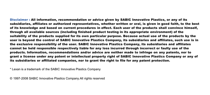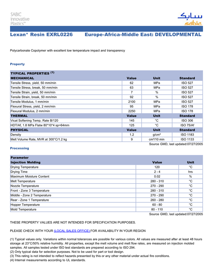 应用范围:产品描述LEXAN PC EXRL0226物性表Polycarbonate Copolymer with excellent low temperature IMPACT and transparency