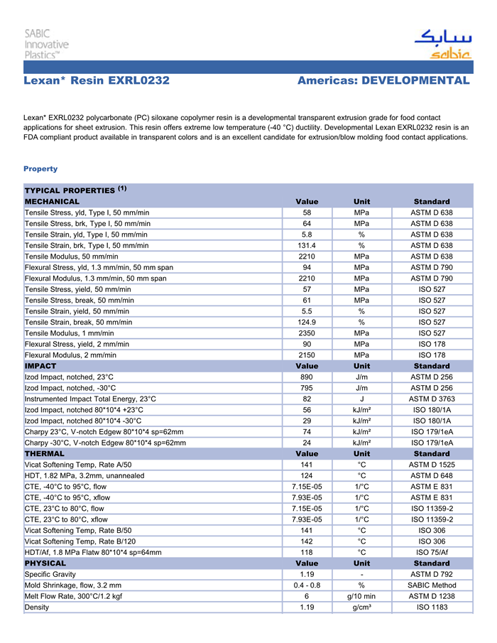 Lexan* EXRL0232 polycarbonate (PC) siloxane copolymer resin is a developmental transparent extrusion grade for food contact applications for sheet extrusion. This resin offers extreme low temperature (-40 °C) ductility. Developmental Lexan EXRL0232 resin is an FDA compliant product available in transparent colors and is an excellent candidate for extrusion/blow molding food contact applications.