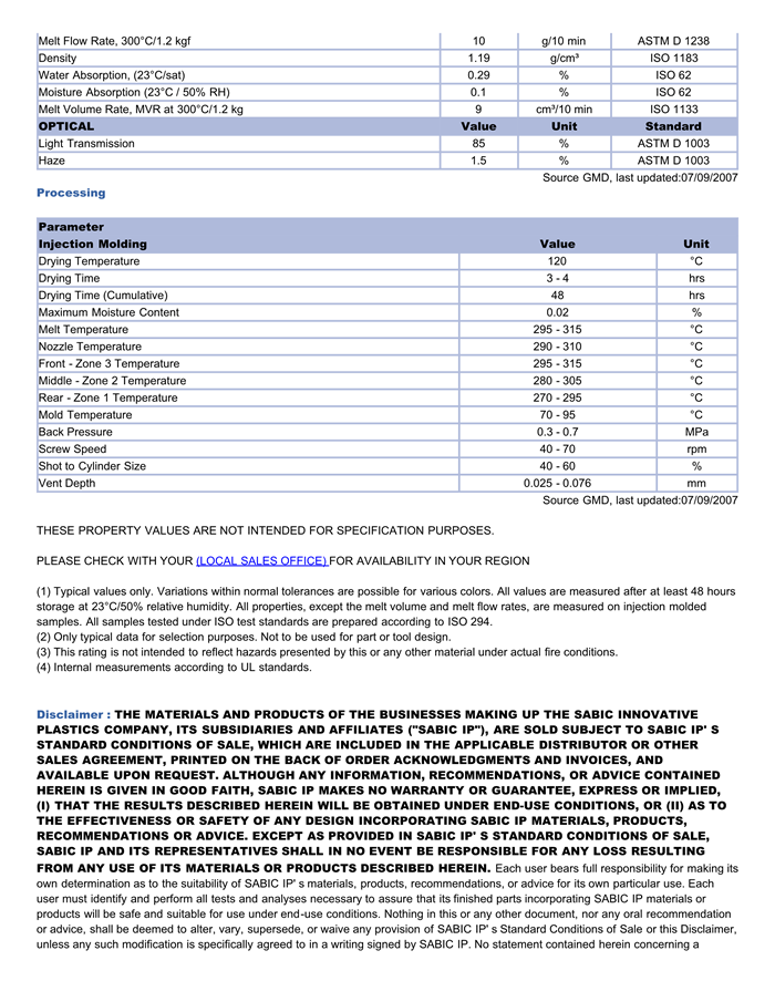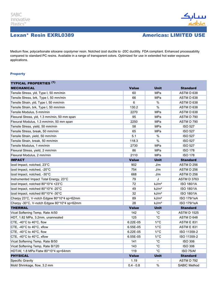应用范围:产品描述LEXAN PC EXRL0389物性表Medium flow, polycarbonate siloxane copolymer resin. Notched izod ductile to -20C ductility. FDA compliant. Enhanced processability compared to standard PC resins. Available in