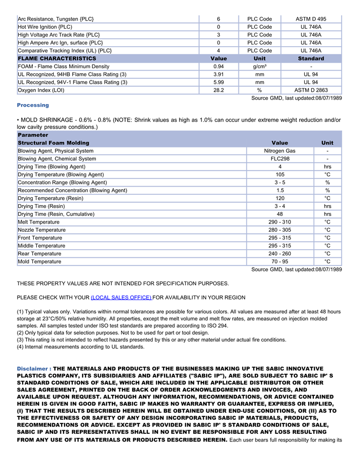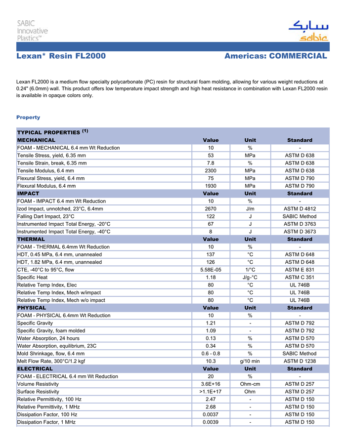 应用范围:产品描述Lexan PC FL2000物性表壁厚0.250″ (6.35mm)时的各类减重。低温抗冲击、耐高温。优异的表面外观。V-0 – 0.250″ (6.35 mm)。Lexan FL2000 is a medium flow specialty polycarbonate (PC) resin for structural foam molding, allowing for variou