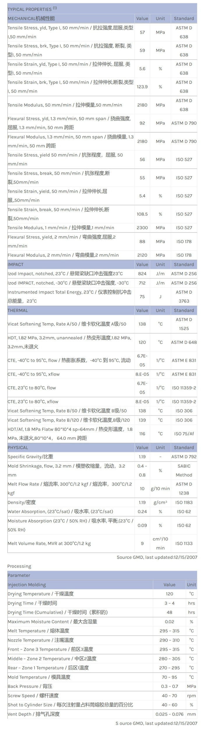 应用范围:产品描述LEXAN PC FXE1434T物性表Lexan* EXL1434T polycarbonate (PC) siloxane copolymer resin is a UV stabilized transparent injection molding grade. This resin offers extreme low temperature (-40 C) ductility