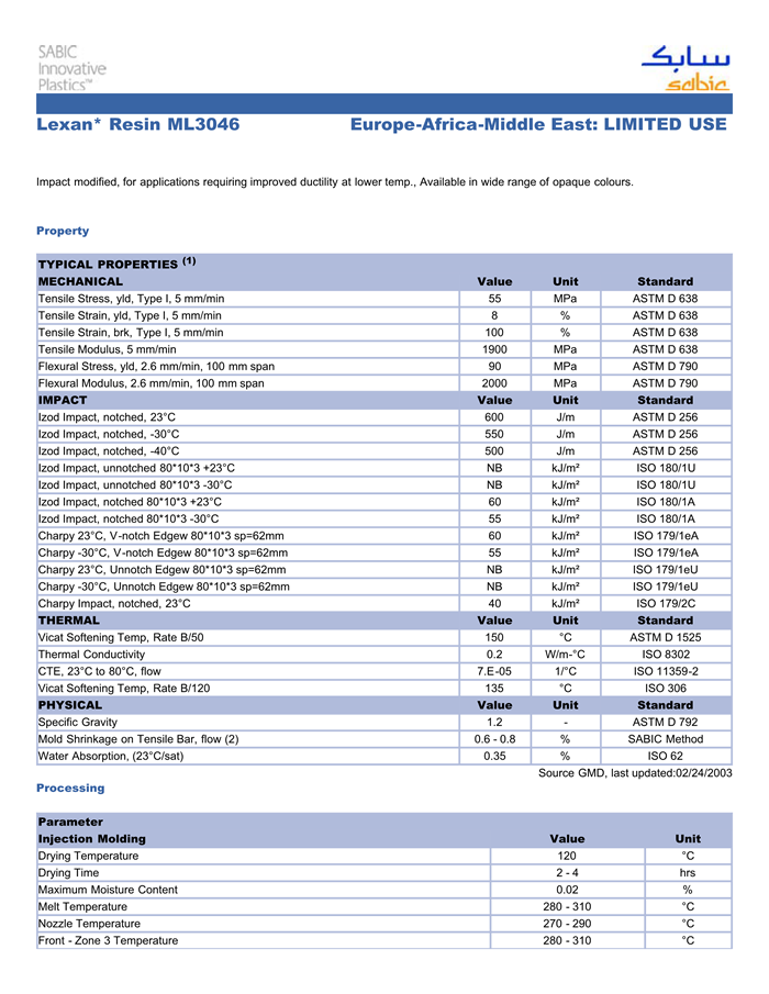 应用范围:产品描述LEXAN PC ML3046物性表IMPACT modified, for applications requiring improved ductility at lower temp., Available in wide range of opaque colours.