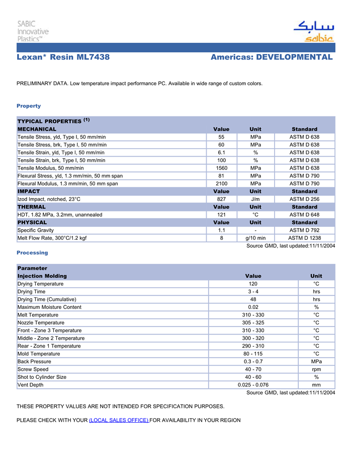 应用范围:产品描述LEXAN PC ML7438物性表PRELIMINARY DATA. Low temperature IMPACT performance PC. Available in wide range of custom colors.