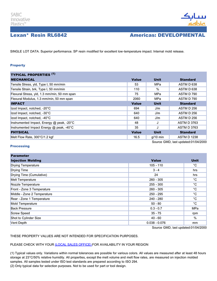 应用范围:产品描述LEXAN PC RL6842物性表SINGLE LOT DATA. Superior performance. SP resin modified for excellent low-temperature IMPACT. Internal mold release.