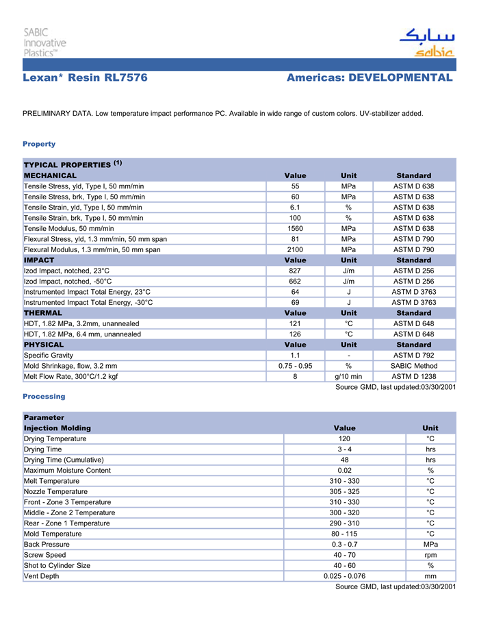 应用范围:产品描述LEXAN PC RL7576物性表PRELIMINARY DATA. Low temperature IMPACT performance PC. Available in wide range of custom colors. UV-stabilizer added.