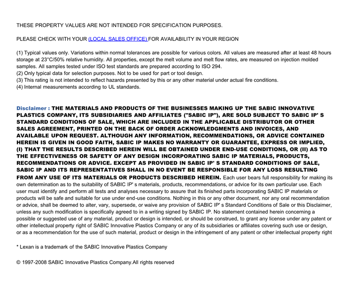 PRELIMINARY DATA. Low temperature IMPACT performance PC. Available in wide range of custom colors. UV-stabilizer added.