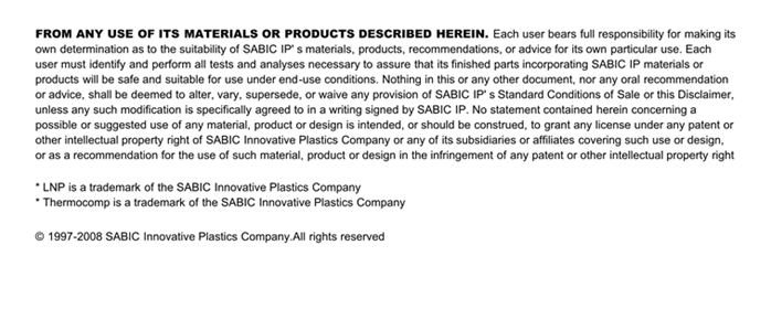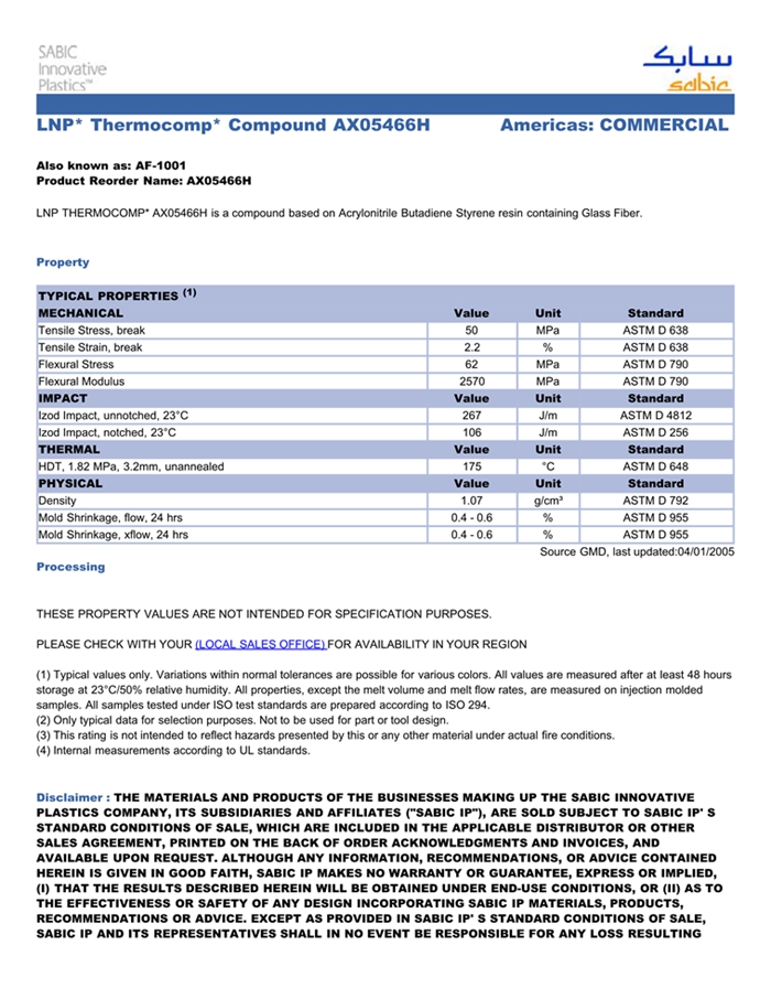 应用范围: 产品描述 LNP Thermocomp AX05466H物性表 LNP THERMOCOMP AX05466H是一种丙烯腈丁二烯苯乙烯(ABS)材料,含有的填充物为玻璃纤维增强材料。 LNP THERMOCOMP* AX05466H is a compound based on Acrylonitrile Butadiene Styrene resin containing Glass