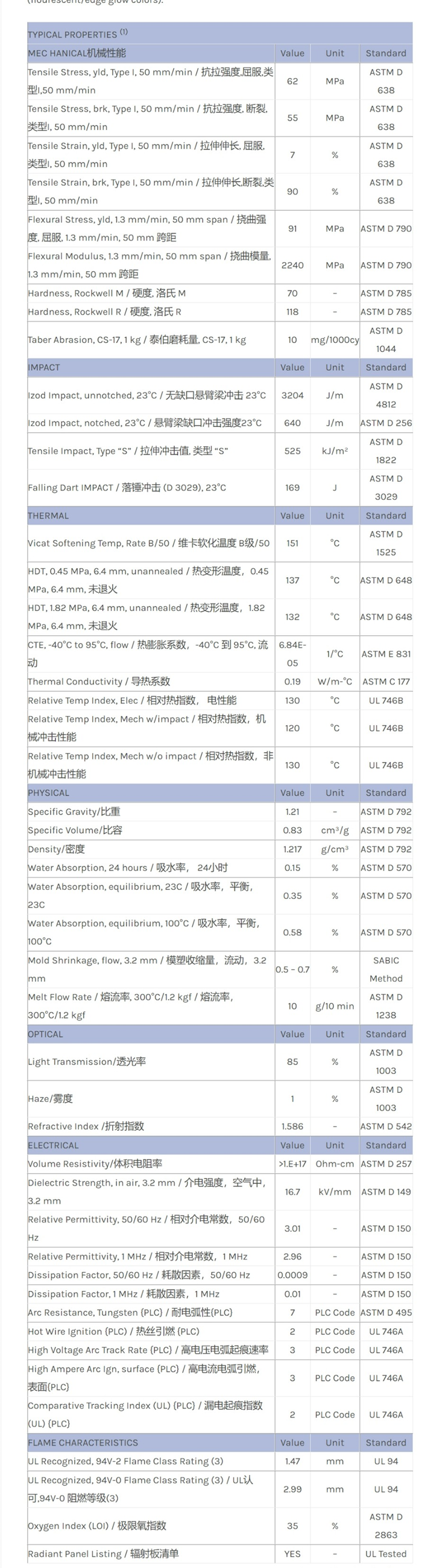 应用范围: 产品描述 LEXAN PC FXD941A物性表 Lexan FXD941A resin是一种聚碳酸酯(PC)产品,它可以通过注射成型进行加工。 相关色号:FXD941A-NA1057X、FXD941A-BK1B230X、FXD941A-WH4500X、FXD941A-GY1962X、FXD941A-NA8D016X