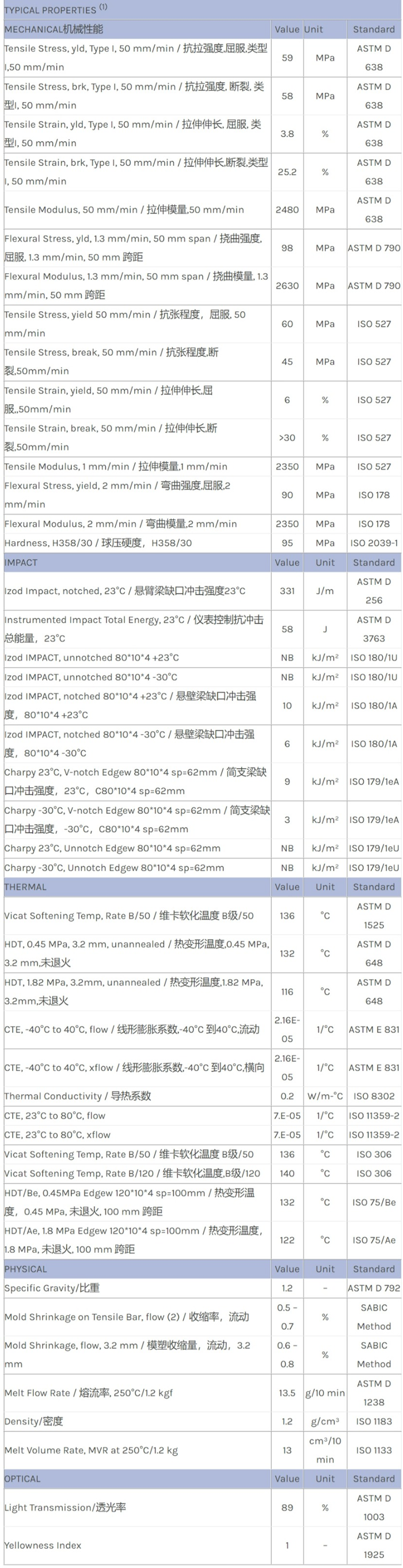 应用范围: 产品描述 LEXAN PC OQ1050物性表 Optical quality, high flow, high purity PC resin for CD/DVD applications. Designed for shorter cycle times.