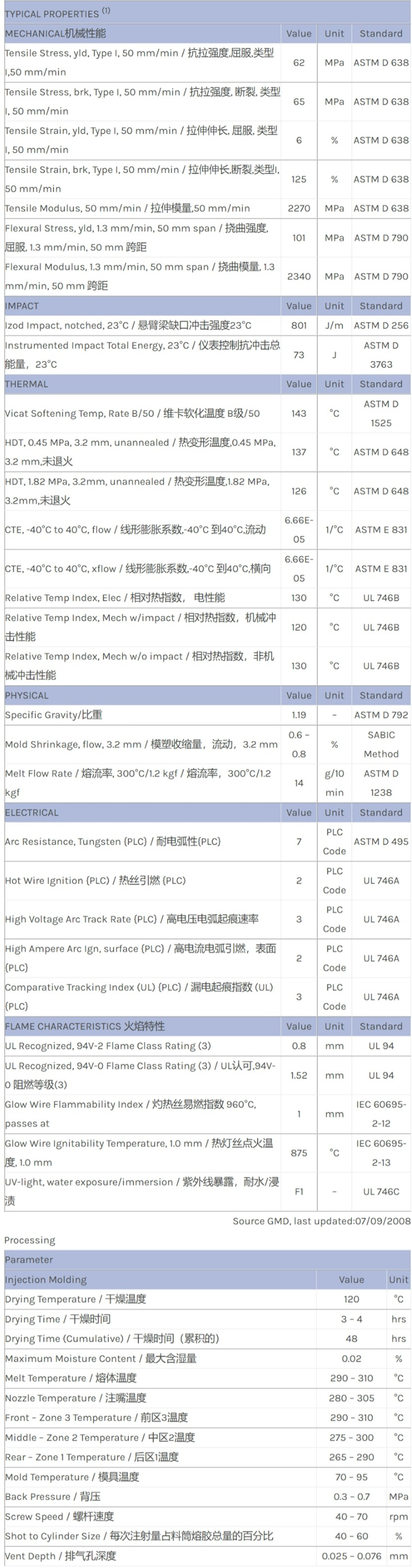 应用范围: 产品描述 LEXAN PC 925U物性表 Lexan* 925U Polycarbonate (PC) resin is a non-filled, injection moldable grade. This non-chlorinated, non-brominated flame retardant PC has an UL-94 V0 rating and is UV stabi