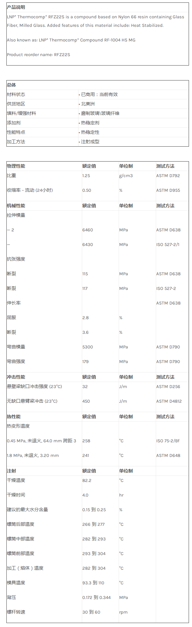 应用范围:产品描述LNP THERMOCOMP RFZ22S物性表