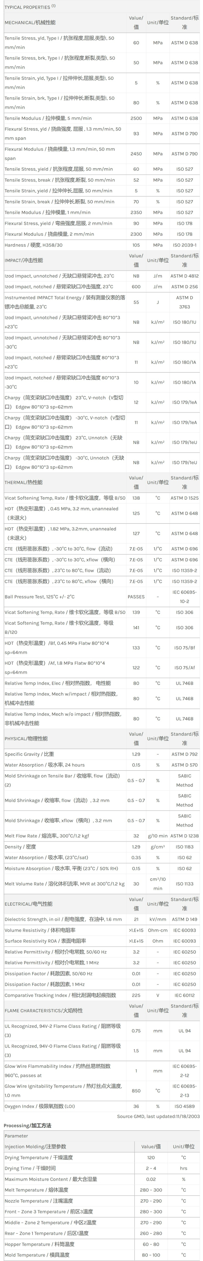 应用范围: 产品描述 Lexan PC BFL2000物性表 无溴无氯阻燃的PC 。有不透明的白色。 相关颜色色号:BFL2000-WH3150 Non-Brominated, non-chlorinated flame retardant PC. Available in opaque white colors. Property/特性