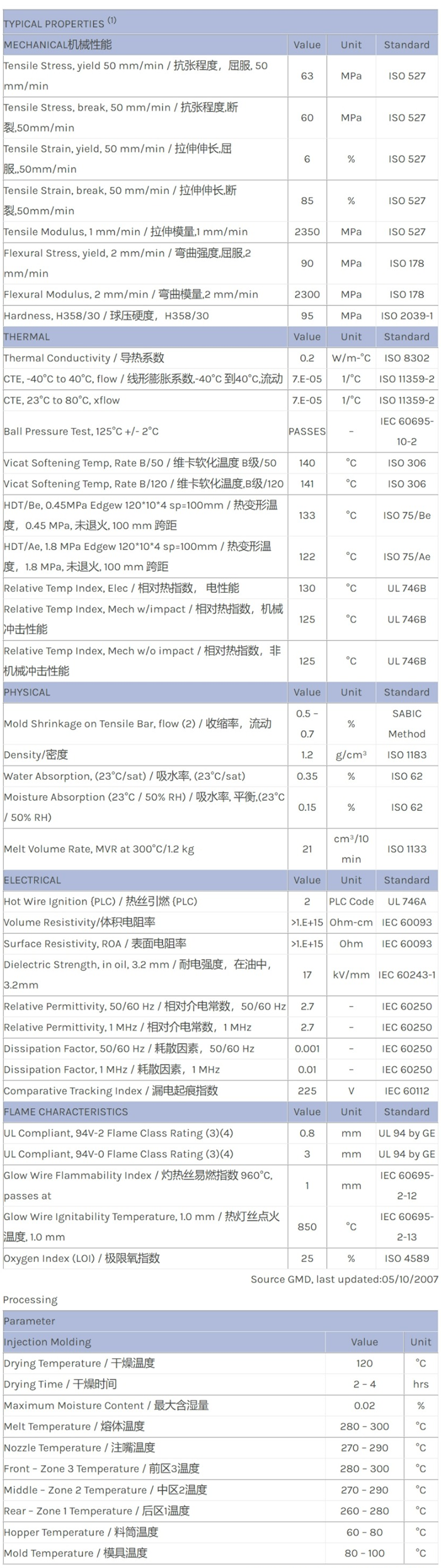 应用范围: 产品描述 LEXAN PC EXRL0434物性表 Lexan* EXRL0434 is a low viscosity, non-filled, injection moldable grade of non-chlorinated, non-brominated flame retardant systems that has an UL-94 V0 rating. Lexan* EX