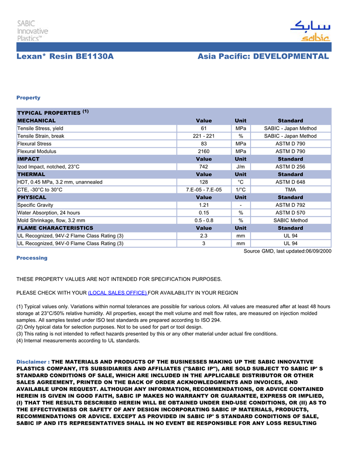 应用范围: 产品描述 LEXAN PC BE1130A物性表