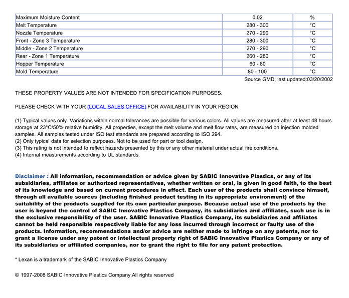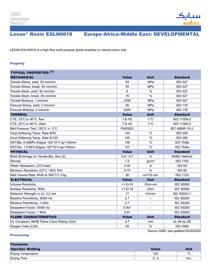 应用范围: 产品描述 LEXAN PC EXLN0018物性表 LEXAN EXLN0018 is a high flow multi purpose grade available in natural colour only.