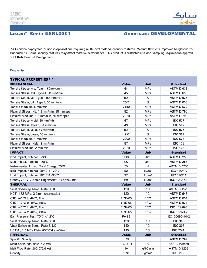 应用范围: 产品描述 LEXAN PC EXRL0201物性表 PC-Siloxane copolymer for use in applications requiring multi-level material security features. Medium flow with improved toughness vs. standard PC. Some security feature