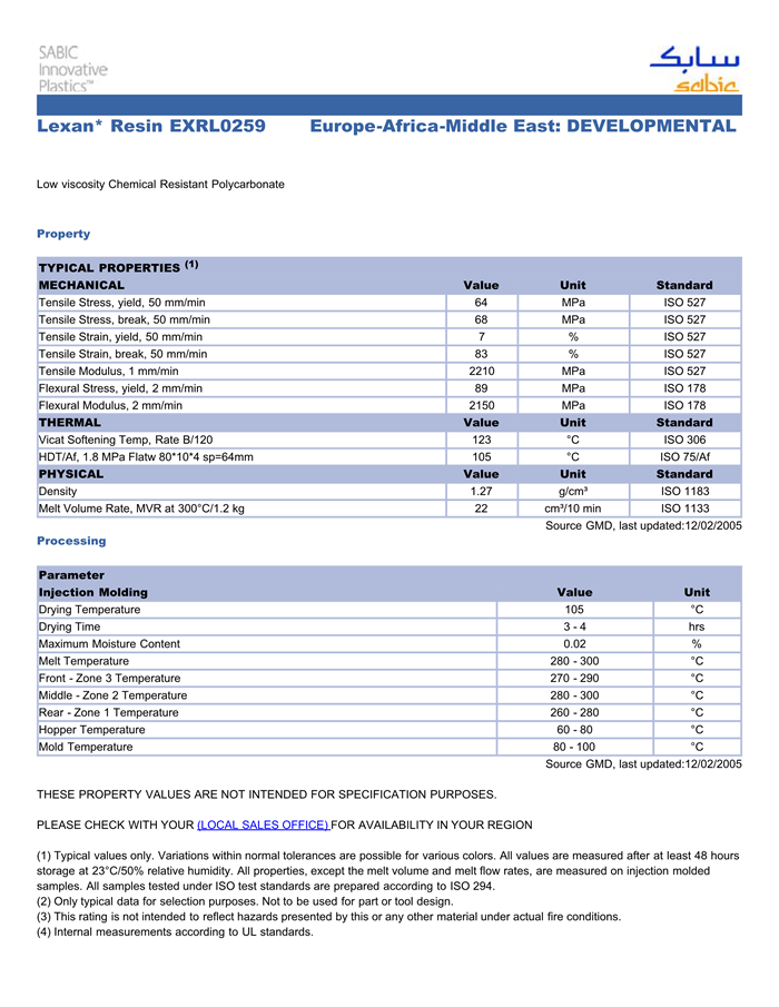 LEXAN PC EXRL0259物性表