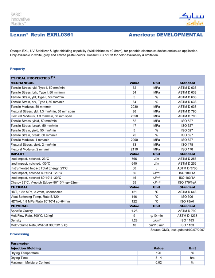 应用范围: 产品描述 LEXAN PC EXRL0361物性表 Opaque EXL, UV-Stabilizer & light shielding capability (Wall thickness >0.8mm), for portable electronics device enclosure application. Only available in white, grey an