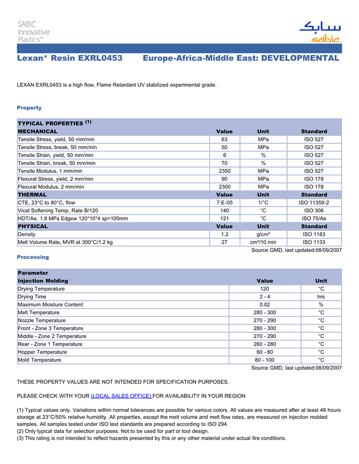 LEXAN EXRL0453 is a high flow, Flame Retardant UV stabilized experimental grade.
