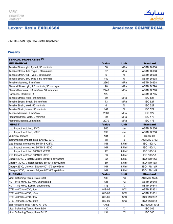 应用范围: 产品描述 LEXAN PC EXRL0684物性表 7 MFR LEXAN High Flow Ductile Copolymer