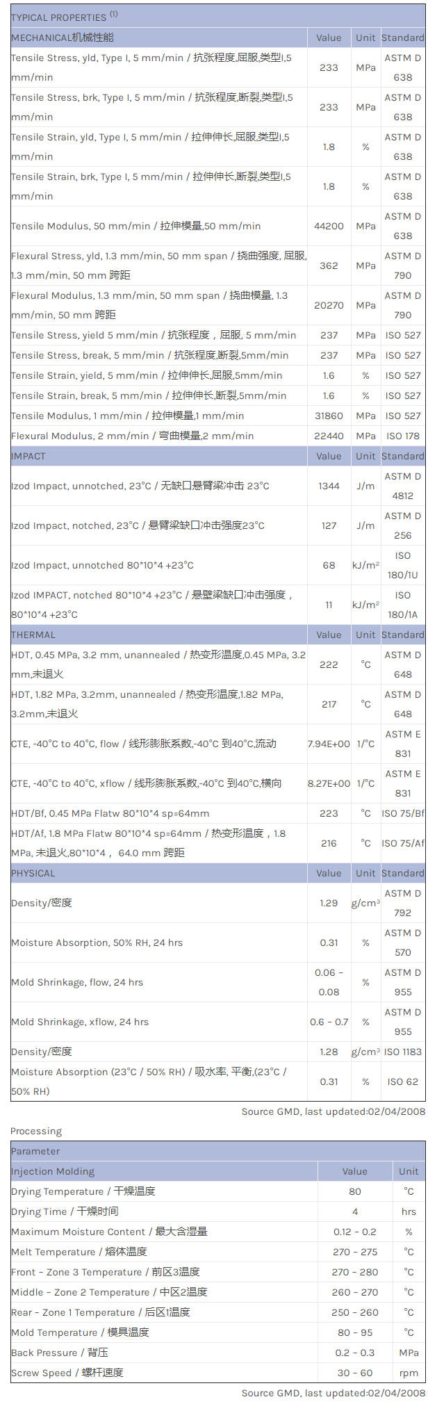 应用范围: 产品描述 LNP THERMOCOMP QC008物性表 LNP THERMOCOMP QC008是一种聚酰胺610(尼龙6/10)产品,含有的填充物为40%碳纤维增强材料,可以通过注射成型进行加工。 主要特性为:传导性。