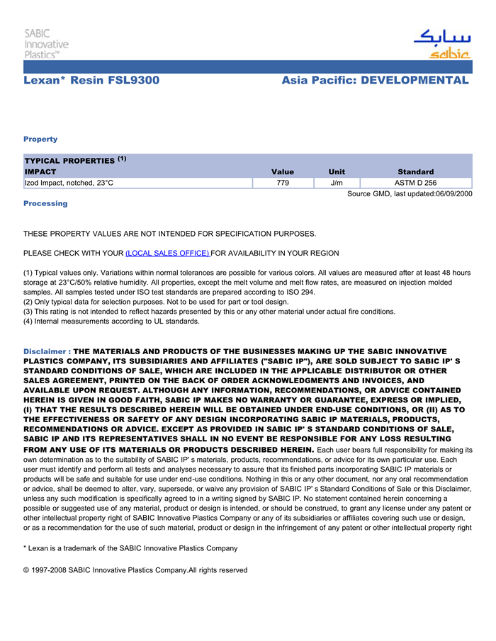 应用范围: 产品描述 LEXAN PC FSL9300物性表
