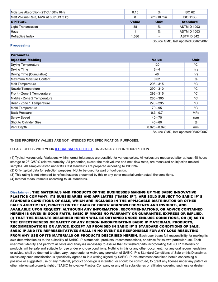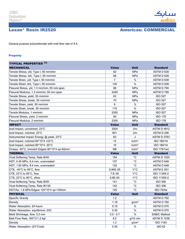 应用范围:产品描述LEXAN PC IR2520物性表General purpose polycarbonate with Melt Flow Rate / 熔流率 of 8.5