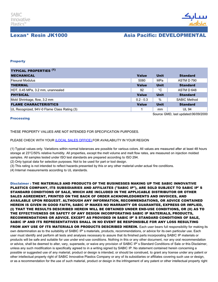 LEXAN PC JK1000物性表