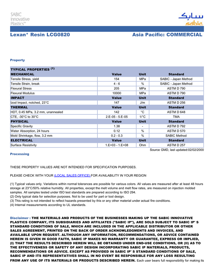 应用范围:产品描述LEXAN PC LCG0820物性表