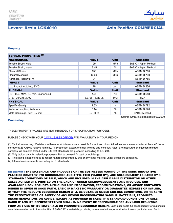 Lexan LGK4010 resin是一种聚碳酸酯(PC)材料,该产品在亚太地区有供货。