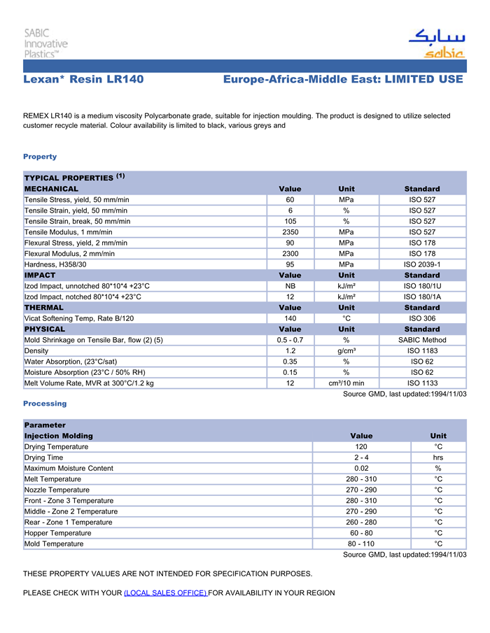 应用范围:产品描述LEXAN PC LR140物性表REMEX LR140 is a medium viscosity Polycarbonate grade, suitable for injection moulding. The product is designed to utilize selected customer recycle material. Colour availability
