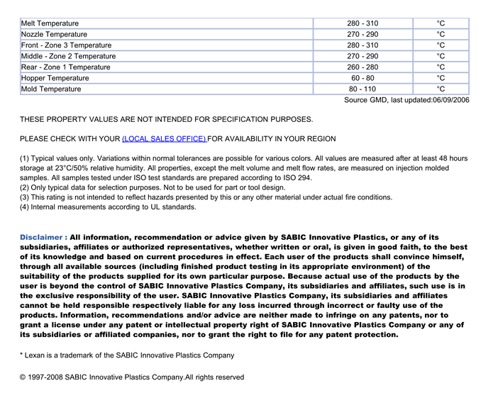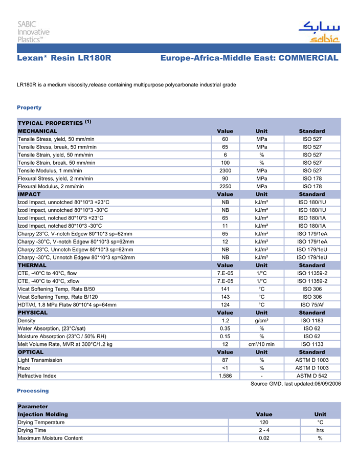 应用范围:产品描述LEXAN PC LR180R物性表LR180R is a medium viscosity,release containing multipurpose polycarbonate industrial grade