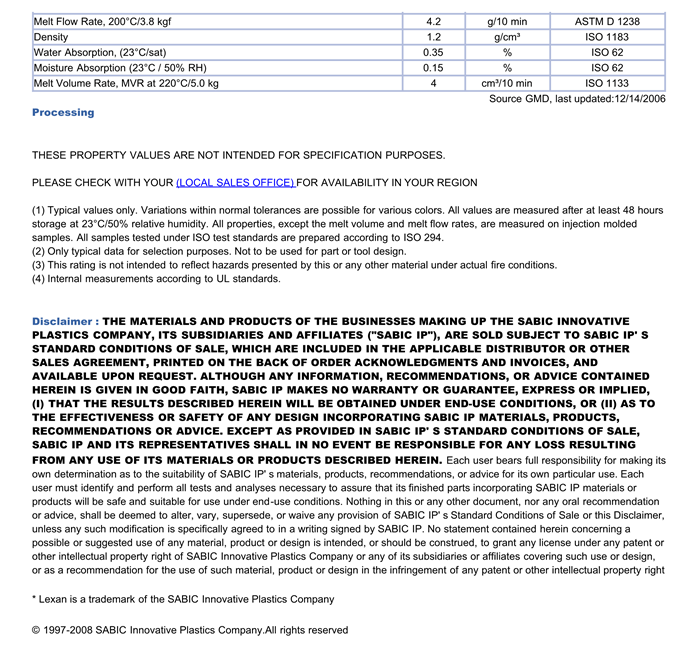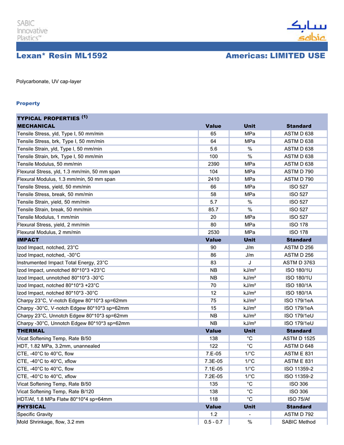 应用范围:产品描述LEXAN PC ML1592物性表Polycarbonate, UV cap-layer