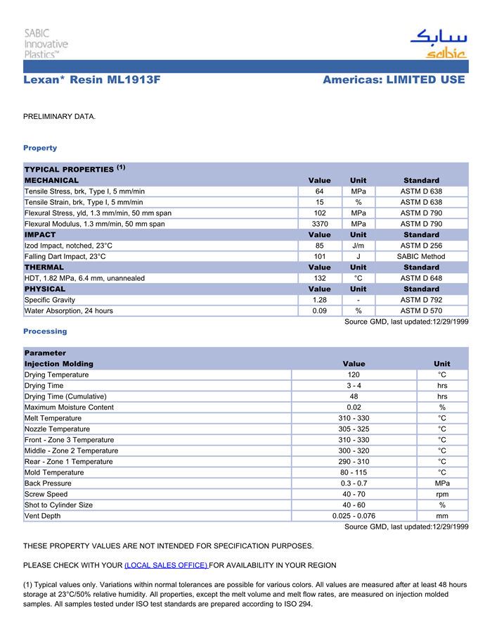 应用范围:产品描述LEXAN PC ML1913F物性表PRELIMINARY DATA.