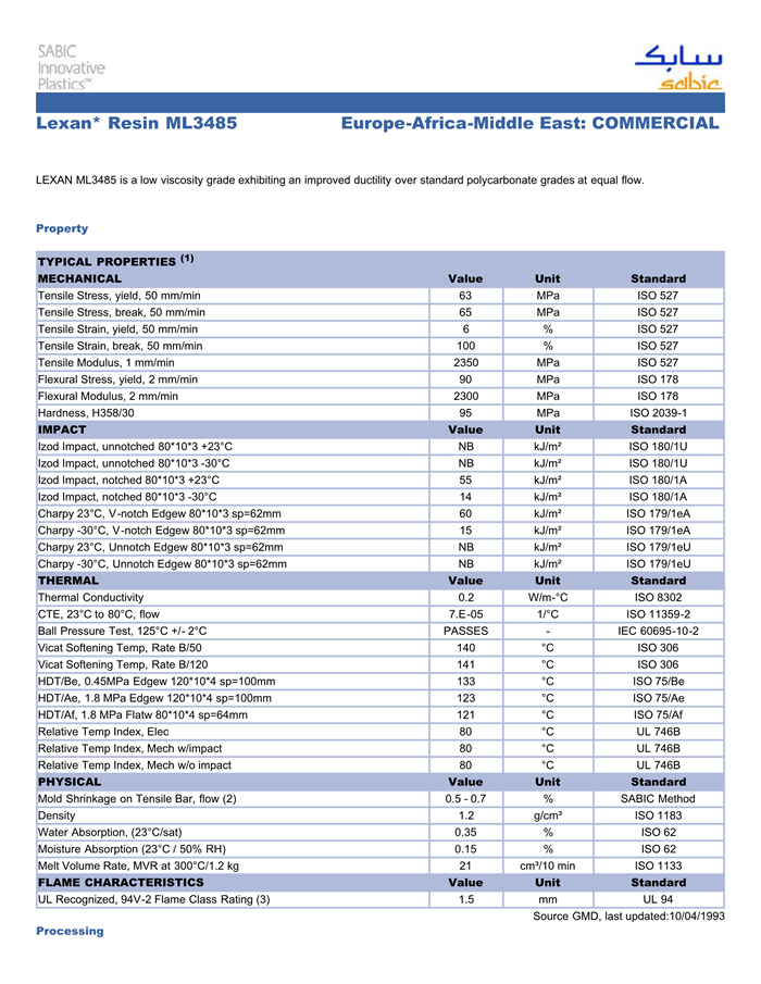 LEXAN ML3485 is a low viscosity grade exhibiting an improved ductility over standard polycarbonate grades at equal flow.