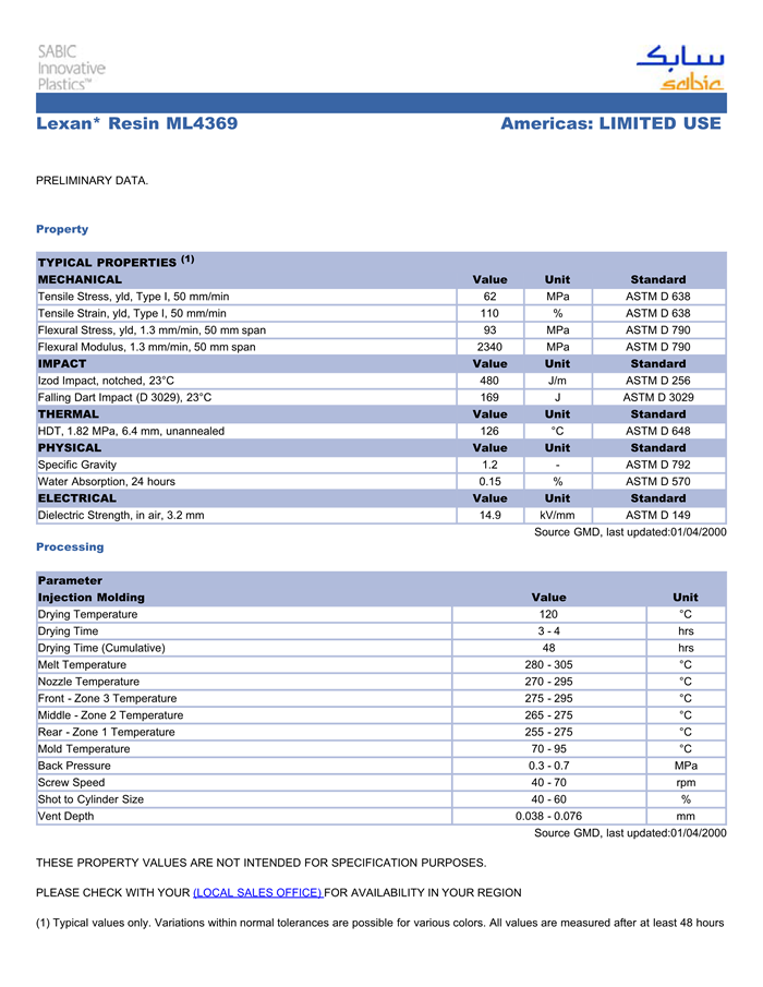 应用范围:产品描述LEXAN PC ML4369物性表PRELIMINARY DATA.
