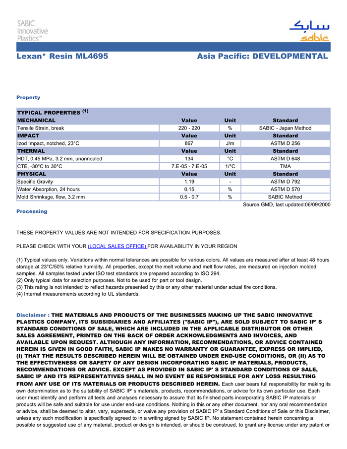 应用范围:产品描述LEXAN PC ML4695物性表
