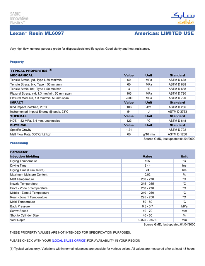 应用范围:产品描述LEXAN PC ML6097物性表Very high flow, general purpose grade for disposables/short life cycles. Good clarity and heat resistance.