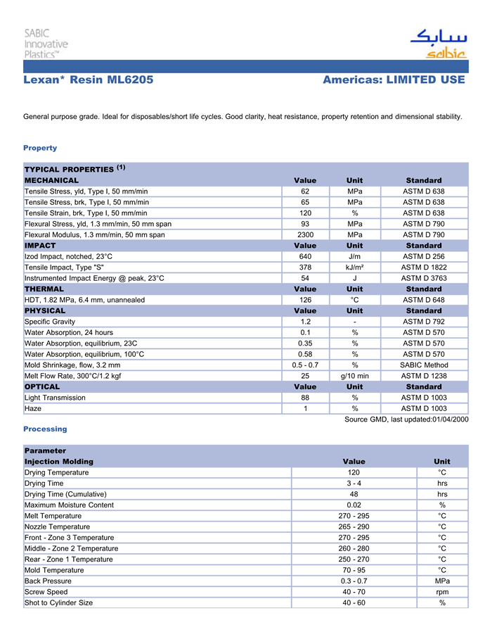 应用范围:产品描述LEXAN PC ML6205物性表General purpose grade. Ideal for disposables/short life cycles. Good clarity, heat resistance, property retention and dimensional stability.