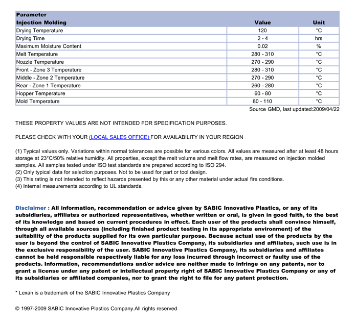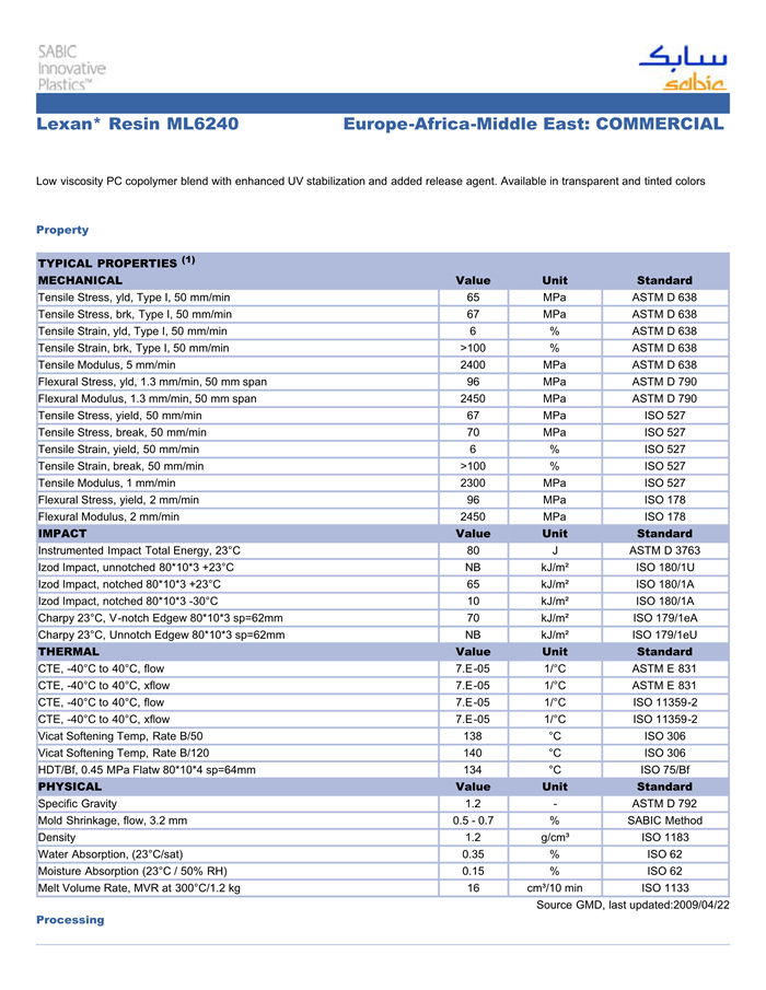 LEXAN PC ML6240物性表