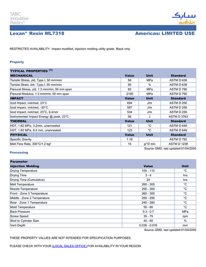 应用范围:产品描述LEXAN PC ML7318物性表RESTRICTED AVAILABILITY. IMPACT modified, injection molding utility grade. Black only.