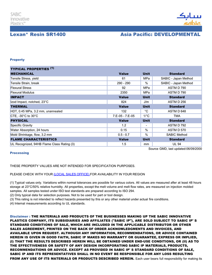 应用范围:产品描述LEXAN PC SR1400物性表
