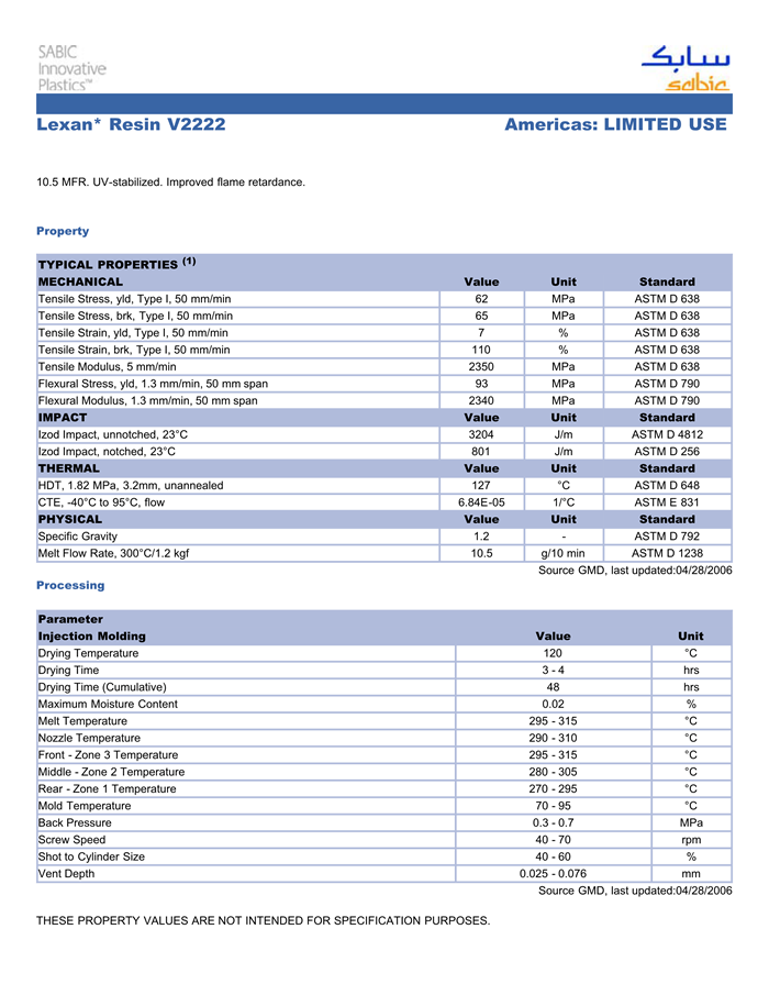应用范围:产品描述LEXAN PC V2222物性表10.5 MFR. UV-stabilized. Improved flame retardance.