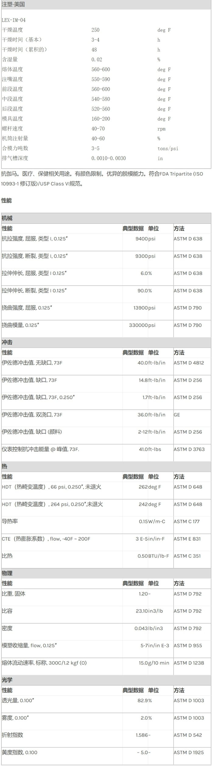 抗伽马。医疗、保健相关用途。有颜色限制。优异的脱模能力。符合FDA Tripartite (ISO 10993-1 修订版)/USP Class VI规范。