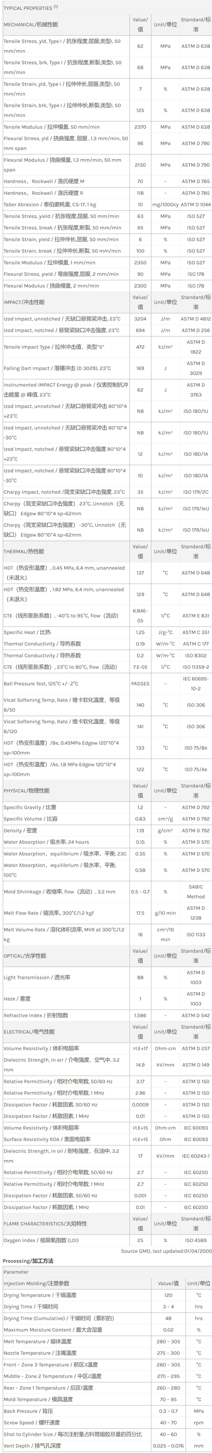应用范围:产品描述Lexan PC HP2R物性表医疗、保健相关用途。黏度、颜色、掺杂物可控。符合FDA tripartite (ISO 10993-1 修订版)/USP Class VI规范。 外用脱模剂。相关颜色色号:HP2R-1H111Med/High flow polycarbonate. For medical devices and pharmaceutical applications. He